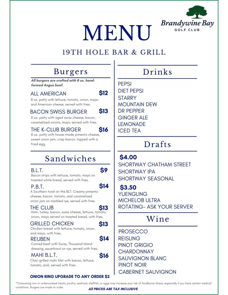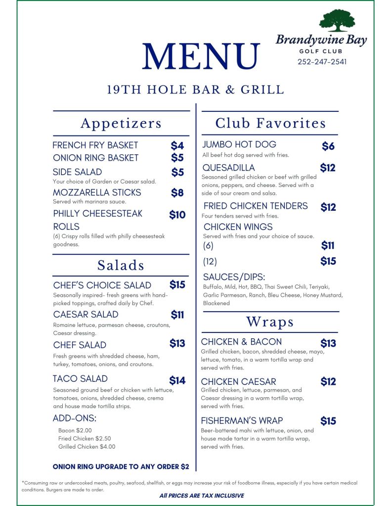 Come enjoy lunch or dinner, along with your favorite beverage, in our quaint clubhouse restaurant with panoramic views of the pine tree lined golf course.